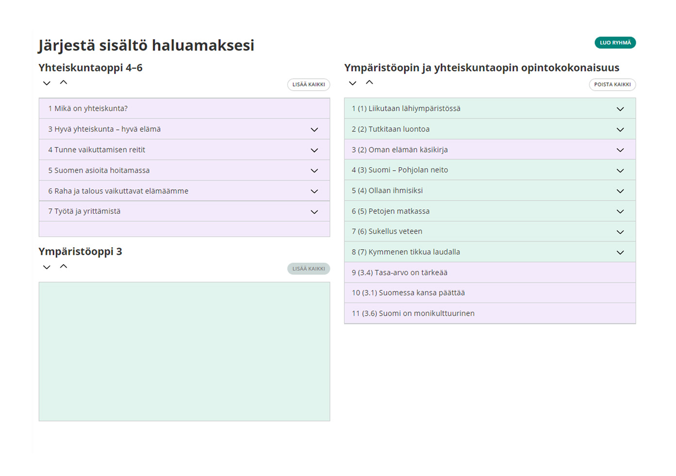 Voit järjestää oppimateriaalin sisällysluettelon haluamaksesi. Oppimateriaalien yhdistäminen on myös mahdollista. Ominaisuus on erittäin hyödyllinen, kun haluat luoda haluamiasi opintokokonaisuuksia ryhmäkohtaisesti.