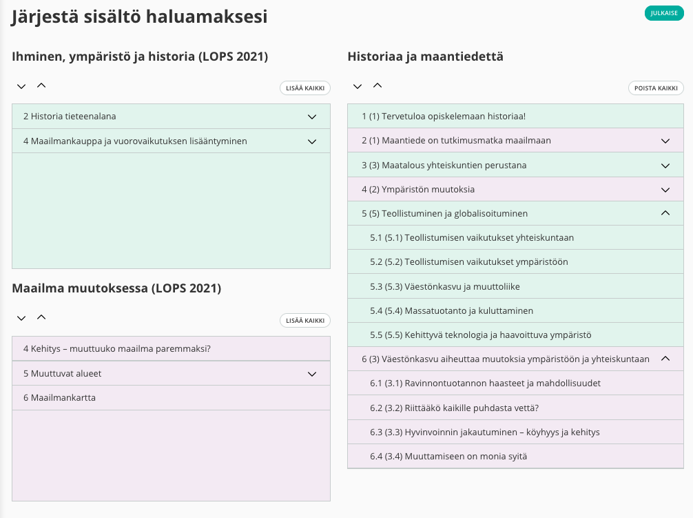 Yhdistä valitsemistasi oppimateriaaleista sinun tarpeisiisi sopivia kokonaisuuksia. Valitse opintokokonaisuuksiin haluamasi sisällöt ja muuta vapaasti niiden järjestystä. Myös yksittäisen oppimateriaalin sisällysluetteloa voit järjestellä juuri niin kuin sinä haluat. Oman sisällön lisääminen onnistuu helposti lukukohtaisesti.