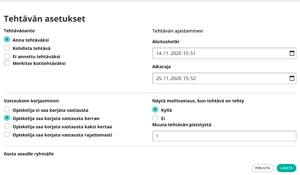 Kohdista tehtäviä tietyille oppilaille tehtäväksi tiettynä ajankohtana yksittäin tai ryhmissä. Anna opiskelijalle mahdollisuus korjata vastaustaan kerran tai useammin. Tehtävien asetukset monipuolistuvat uudella alustalla helpottamaan opettajan työtä entisestään.