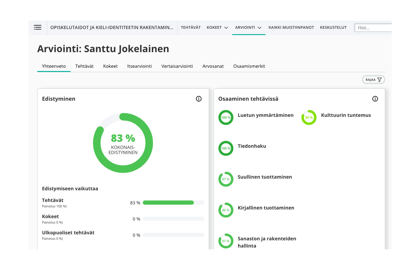 Studeo kerryttää tietoa omasta osaamisestasi. Näet onko sinulla tekemättömiä tehtäviä ja miten olet onnistunut tehtävissä tai kokeissa. Arviointinäkymästäsi näet myös missä taidoissa olet kehittynyt ja oletko saanut opettajalta ohjaavaa palautetta tehtävistä. Tarvittaessa voit pyytää opettajaasi aktivoimaan uudelleen vastaamisen haluamiisi tehtäviin, jotta voit korjata lähettämääsi vastausta. Studeon myötä oppimisestasi tulee siis entistä näkyvämpää ja tavoitteellisempaa.