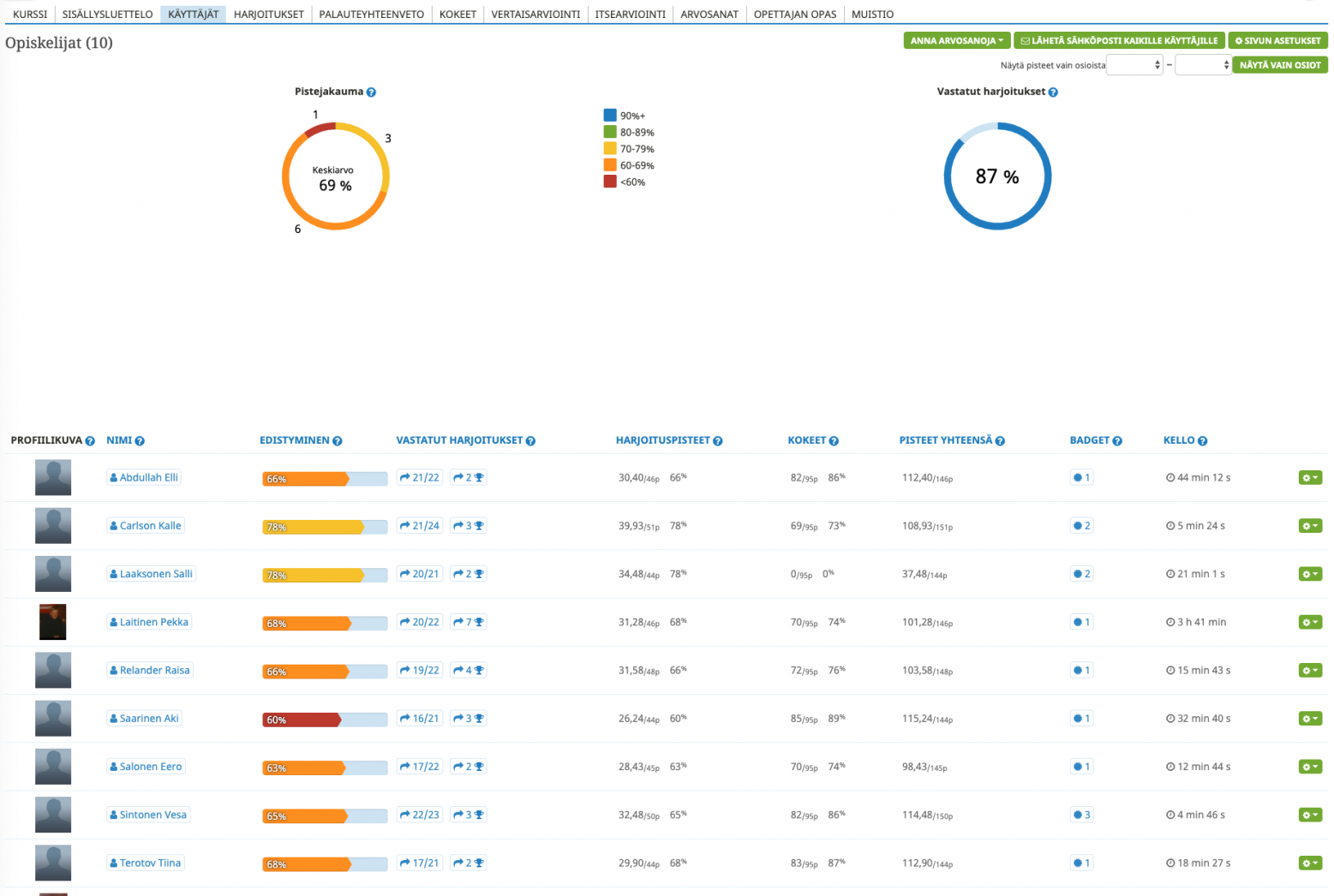 Opettaja ja opiskelijat saavat opintojen edetessä monipuolista tietoa osaamisen kehittymisestä. Opettaja näkee yhdellä silmäyksellä esimerkiksi sen, miten paljon opiskelijat ovat tehneet harjoituksia, kuinka paljon he ovat saaneet pisteitä ja miten pitkään he ovat työskennelleet.Sekä sisältöosaamisesta että taitojen kehittymisestä kertyy tietoa arviointisivulle, kun opiskelija tekee harjoituksia. Opiskelija saa itse kattavasti tietoa osaamisestaan. Studeo tuo esiin sekä vahvuuksia että kehittämiskohteita.Opettaja ja opiskelija näkevät, miten laaja-alainen osaaminen kehittyy.Itsearviointi kannustaa oman oppimisen seuraamiseen ja tukee itsesäätelytaitojen kehittymistä. Opiskelija arvioi omaa edistymistään itsearviointilomakkeella. Opettaja pääsee seuraamaan sekä koko ryhmän että yksittäisen opiskelijan itsearviointeja. Vertaisarviointi-työkalulla opiskelijat arvioivat toistensa laaja-alaista osaamista ryhmätöissä. Opettaja ja opiskelija saavat tiedon kokeissa saavutetusta osaamisesta. Opettaja voi antaa arvosanoja kokeista tai kokonaisosaamisesta.Opettaja valitsee, mikä merkitys kokonaispisteissä on summatiivisella ja formatiivisella arvioinnilla sekä ryhmätöiden vertaisarvioinnilla.