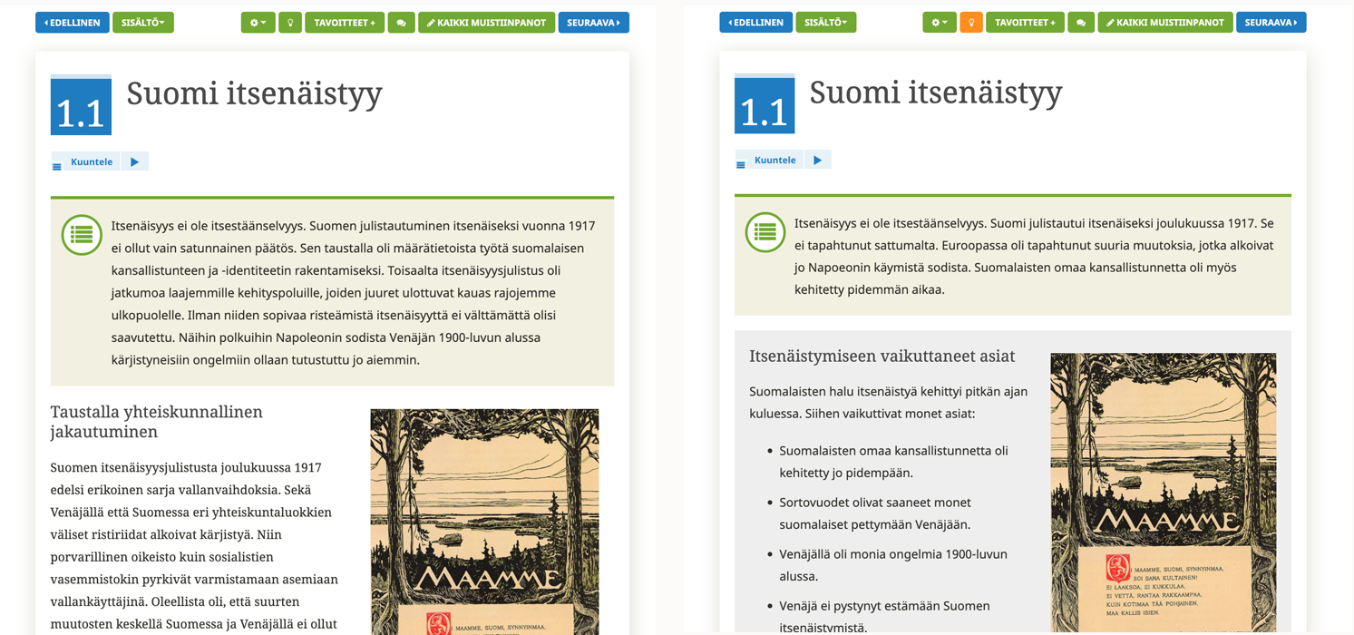 Opiskelija voi valita, käyttääkö hän luvusta perusversiota vai helpotettua versiota. Helpotetun version avulla on myös kätevää kerrata sisältöjä.Studeon oppimateriaalit ohjaavat myös haastavaan sisältöön ja ajankohtaiseen lisätietoon.Harjoitusten avulla on helppo eriyttää opetusta, koska ne on luokiteltu vaikeustason ja taitojen mukaan. Opettaja voi antaa harjoituksia osaamisen mukaan yksittäisille opiskelijoille tai ryhmille. Lähes kaikki oppimateriaalit ovat kuunneltavissa. Myös helpotetun version luvusta voi kuunnella. Osaan sisällöistä on liitetty lukemisen apuvälineitä.